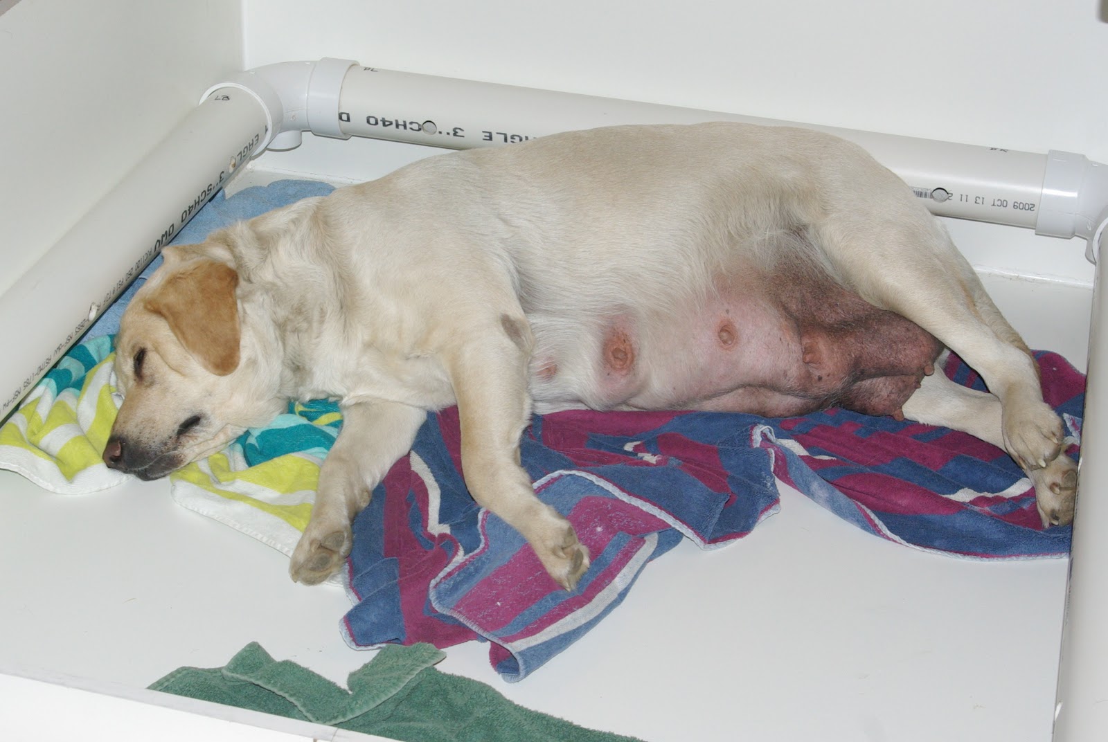 Grand Dam Elsie is expecting and due in about ten days (give or take a couple of days either way). Our bouncy buddy Tuc is the sire (his first time as Master Studly). We expect the litter to have yellow or black coats only this time, and what gorgeous puppies these will be!